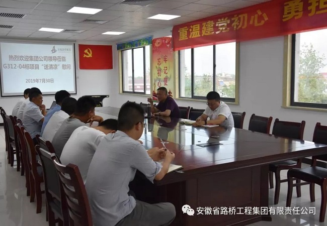7月30日, ,,,,,XPJ官网控股党委委员、董事、副总经理杨广亮到六安G312项目开展“送清凉”慰问活动, ,,,,,并深入调研项目管理工作。。。 。。。。。XPJ官网控股发展规划部部长余志刚陪同调研。。。 。。。。。