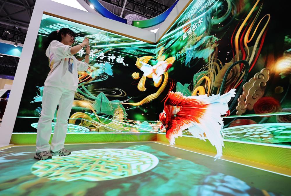 ??2024年4月1日,,,,,,在安徽合肥举办的2024国际显示技术大会上,,,,,,一名观众体验京东方展出的裸眼3D快速拆装折角屏。。。。。。。。