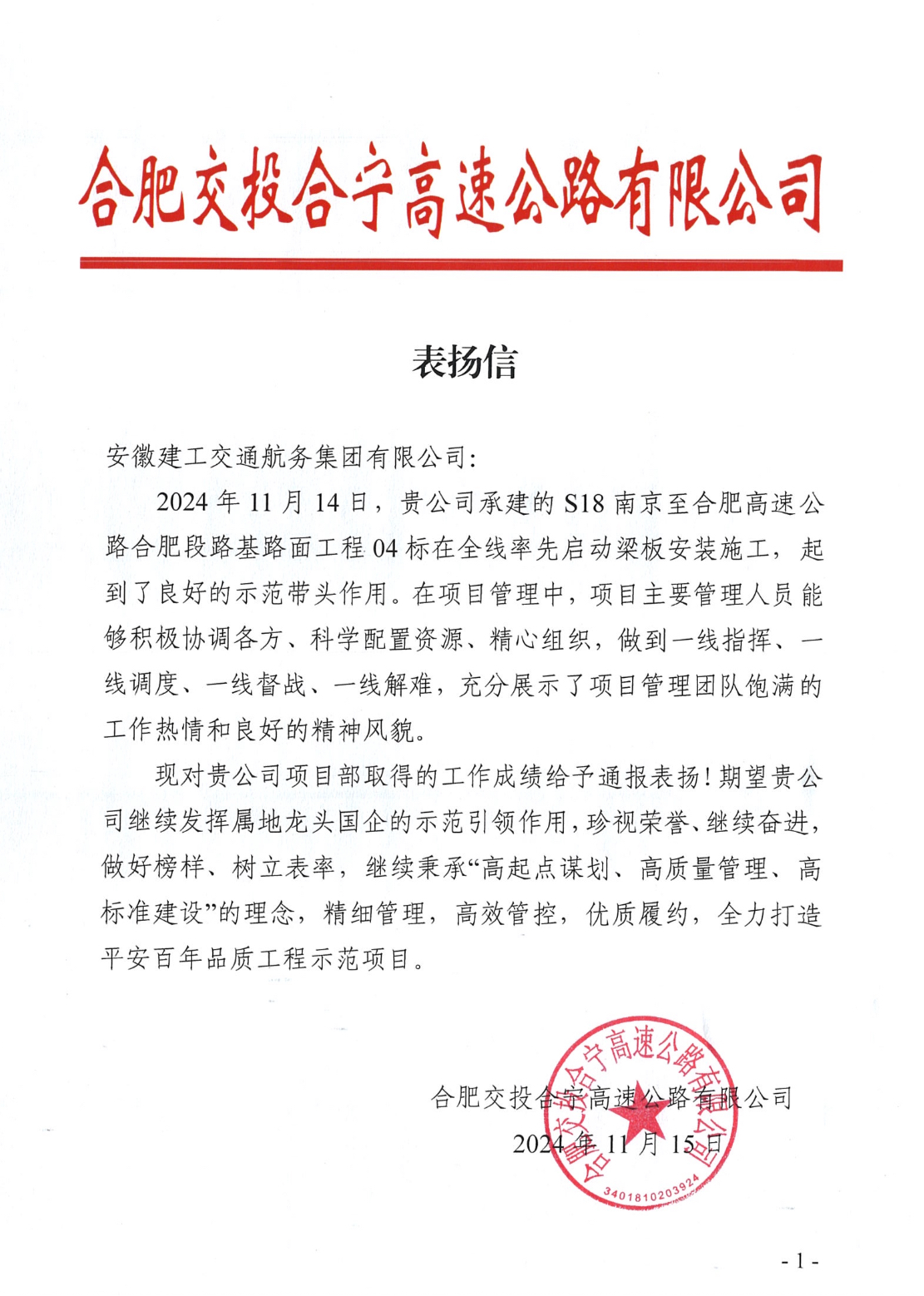 11月15日,,,,,,, ,S18南京至合肥高速公路合肥段路基路面工程04标项目收到来自业主单位-合肥交投合宁高速公路有限公司表扬信。 。。。。。
