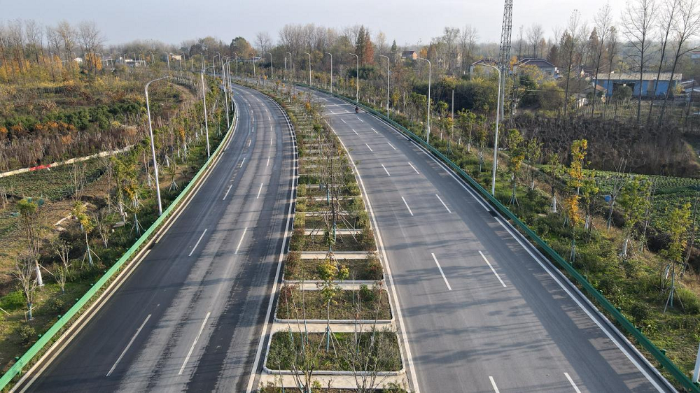 项目总体线路走向由南向北呈“L”布置,,,,,,,全长8.643km,,,,,,,路面宽23m,,,,,,,双向6车道,,,,,,,一级公路兼顾城市主干道功能。。。。。。。施工范围包含路基、路面、桥涵、绿化、照明、给排水、交通工程等内容。。。。。。。