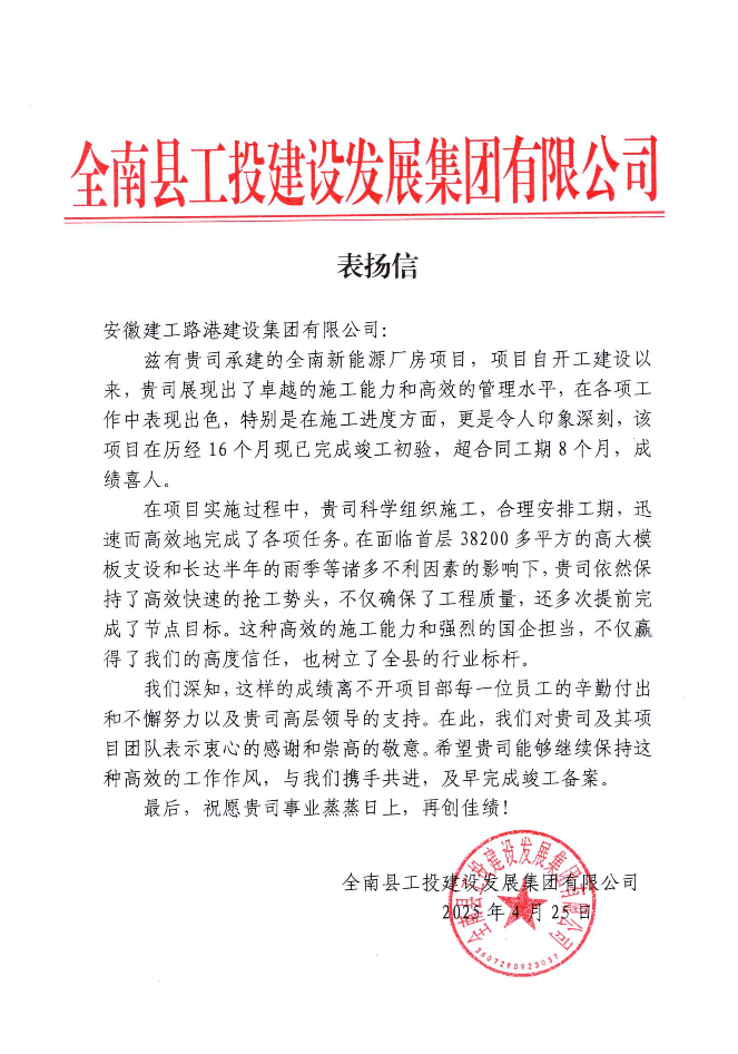 近日,,,,,XPJ官网路港收到江西省全南县工投建设发展集团有限公司发来的表扬信,,,,,信中对公司在全南县新能源产业园标准厂房及配套基础建设项目中的出色表现予以高度肯定。。。。。
