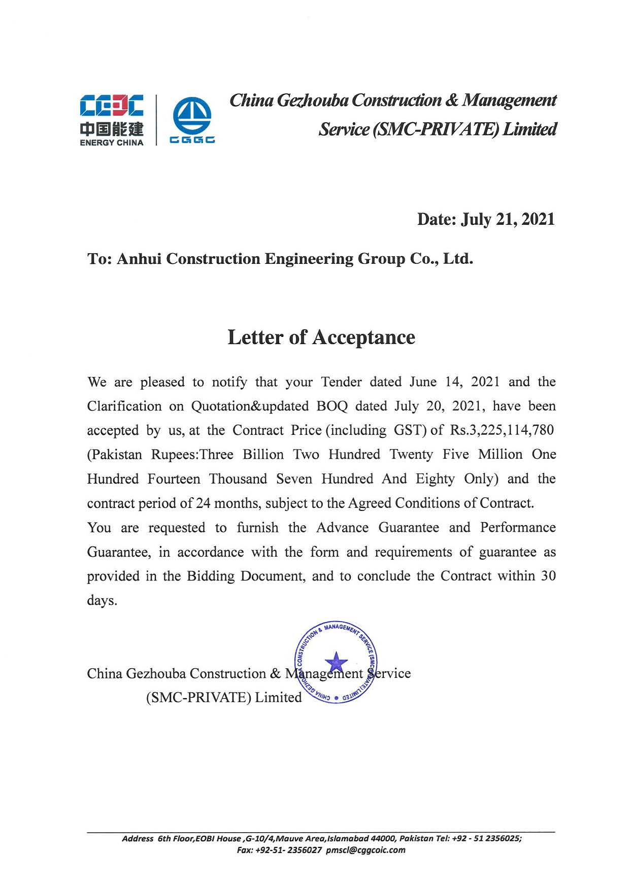 On July 22nd, ACEG has confirmed the receipt of The Letter of Acceptance from China Gezhouba Construction & Management Service (SMC-Private) Limited,,,,,that ACEG has successfully won the bid of the Project - Pakistani Regional Dispatching Center of China Gezhouba Group Overseas Investment Co., Ltd.