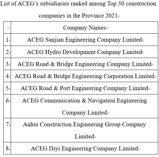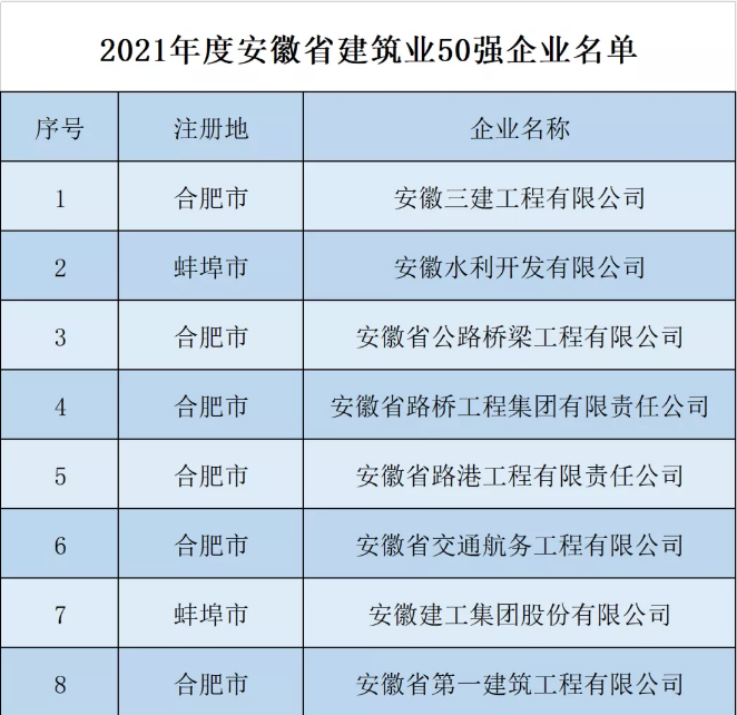 February 10 / Hefei City / Some media reports said,,,,,,,,Anhui Provincial Housing and Urban-rural Development Department announced the list of Top 50 enterprises in construction industry in Anhui Province in 2021, among which 8 subsidiaries from Anhui Construction Engineering Group Holdings Co., Ltd. were ranked as top 50 enterprises in construction industry in Anhui Province in 2021.