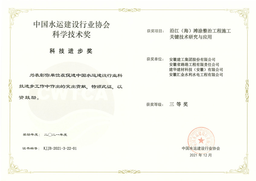 The list of the winners of the “Science and Technology Award of China Waterway Construction Industry Association 2021”was officially announced recently, the scientific research achievement - “Key construction technology research and application for tidal flat regulation engineering along seaside (or riverside)” co-proposed by ACEG headquarters and its subsidiary – ACEG Road and Port Construction Engineering Company Limited, received the third prize of scientific and technological progresses and it marks the first time for AECG Road and Port Construction Engineering Company Limited winning this merit.